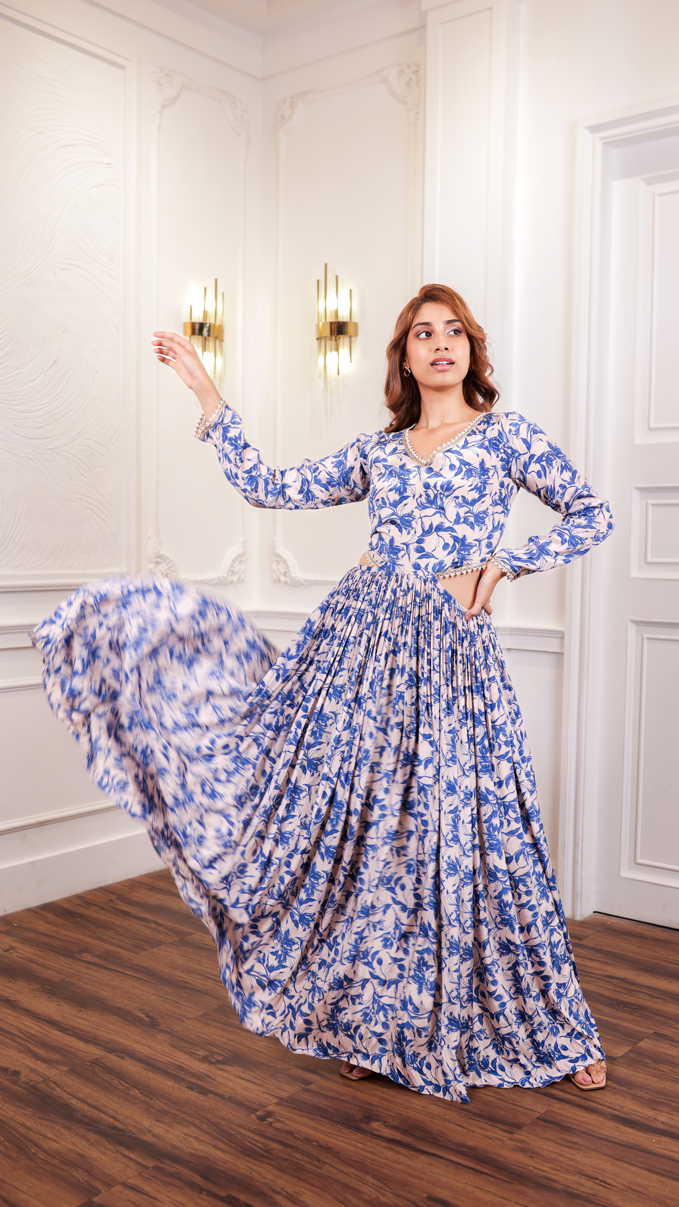 Blue Leaf-Print Halter Crop Top & Skirt Co-ord Set