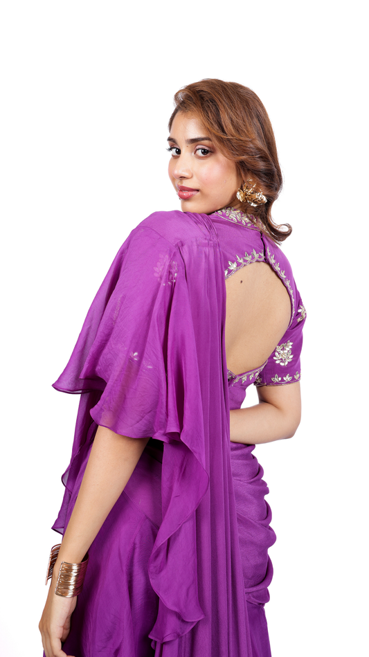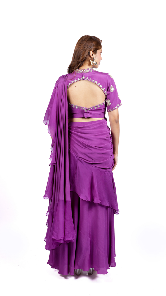 Zyra by Cascades: Purple Embroidered Drape saree set